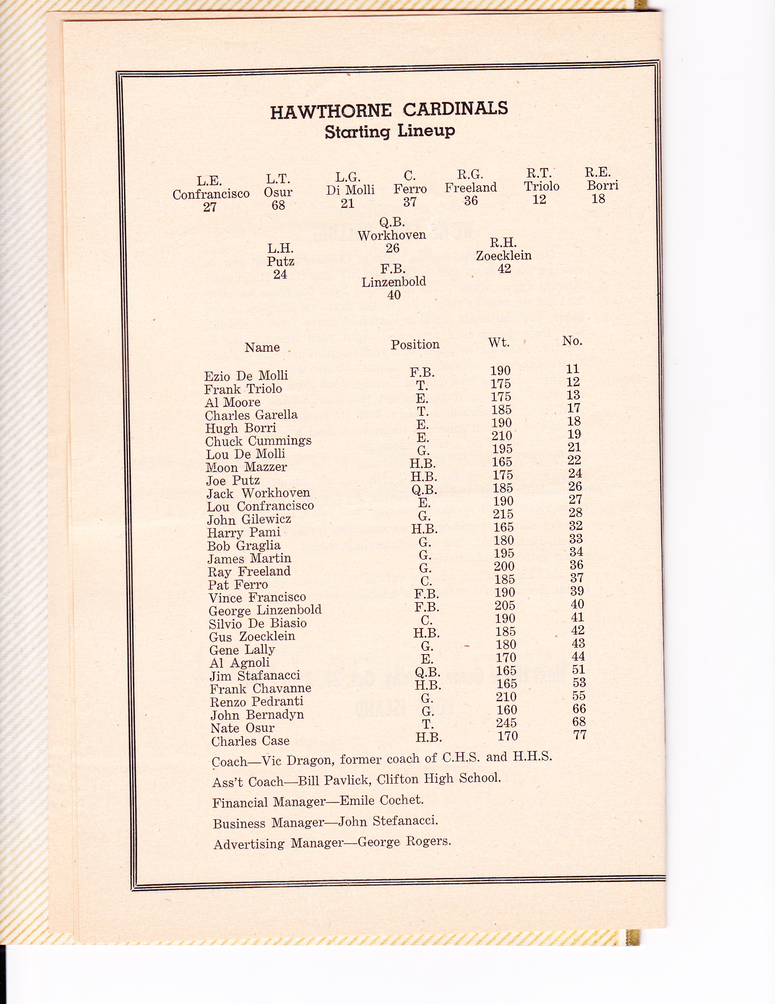 Page 6 of a Cardinals program, Hawthorne Cardinals roster. Most of the team and staff came from the Clifton Vikings, including (at least): E. De Molli, F. Triolo, H. Borri, L. De Molli, M. Mazzer, J. Putz, H. Pami, B. Graglia, G. Linzenbold, A. Agnoli, Jim Stefanacci, R. Pedranti, Coach Vic Dragon, Ass’t. Coach Bill Pavlik, Bus. Mgr. John Stefanacci.