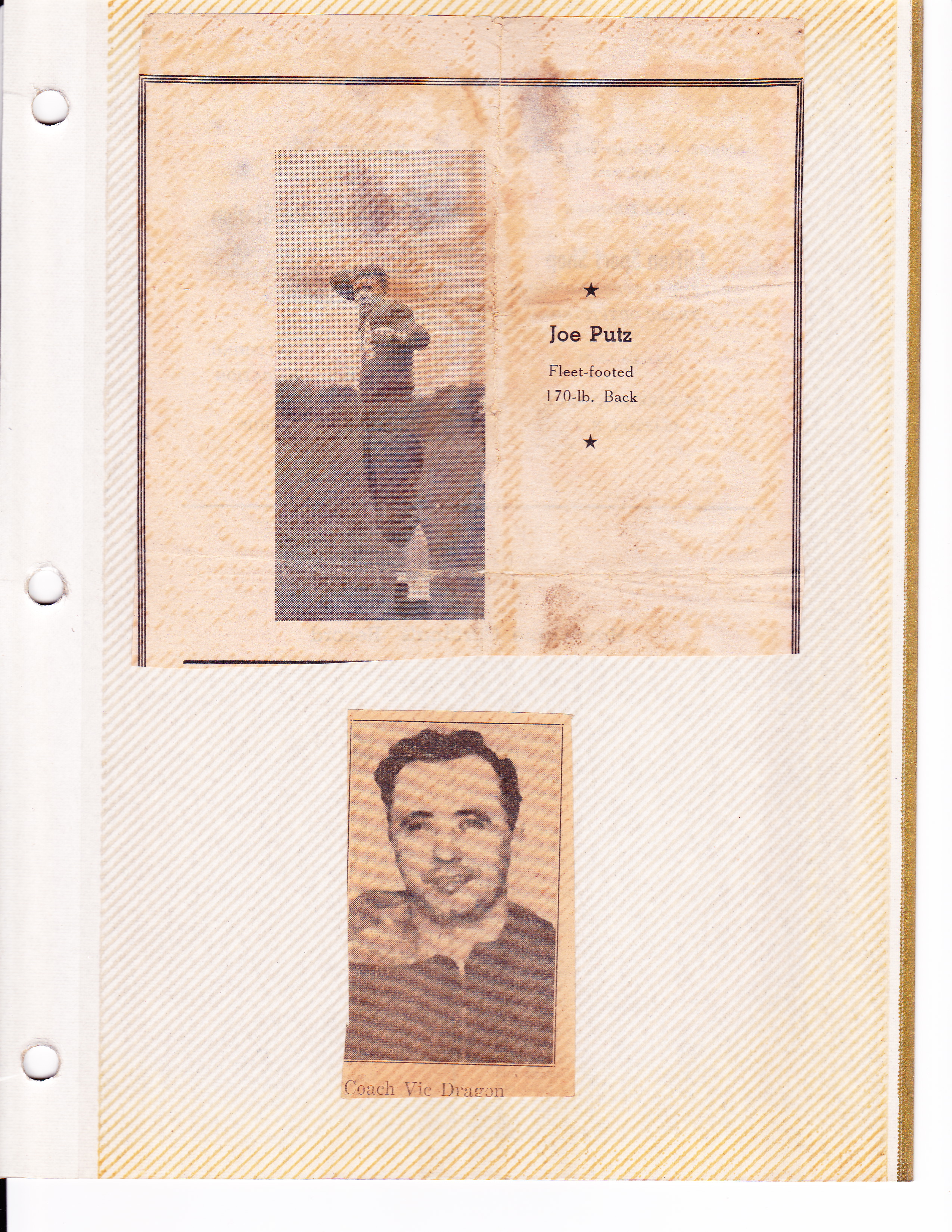 Top: Portion from Cardinals’ program: “Joe Putz” Bottom: newspaper photo of Coach Vic Dragon (coach, at different times, of Vikings, Cardinals, Clifton HS, Hawthorne HS)